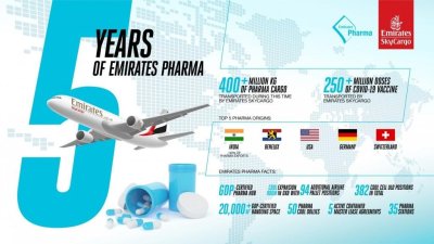 COVID-19 pandemic: During the pandemic, it became even more essential for Emirates SkyCargo to maintain the supply chain across the world for pharmaceutical products, for treatment of COVID-19 and other illnesses. By deploying an increasing number of cargo only flights on passenger aircraft, Emirates SkyCargo offered continued connectivity for the transport of urgently required pharmaceuticals.