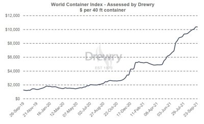 The Drewry World Container Index (WCI) published on 23 September remained steady at US$10,377.19 per FEU, the same level as the week before, however, a whopping 299% year-on-year rise.